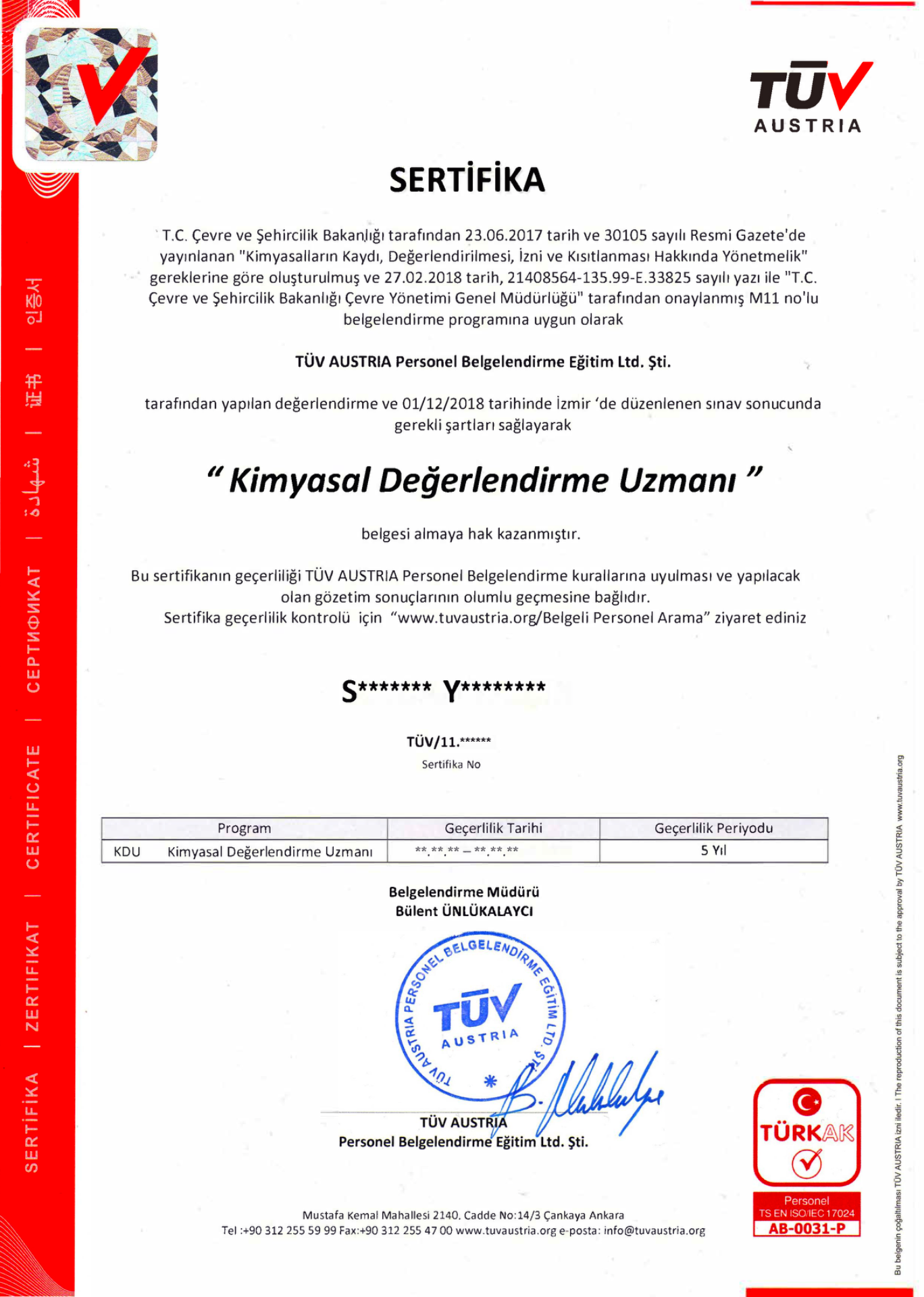 Tüm çalışanlar kimya mühendisi / kimyager derecesine sahip olup sertifikalı kimyasal değerlendirme uzmanıdır.