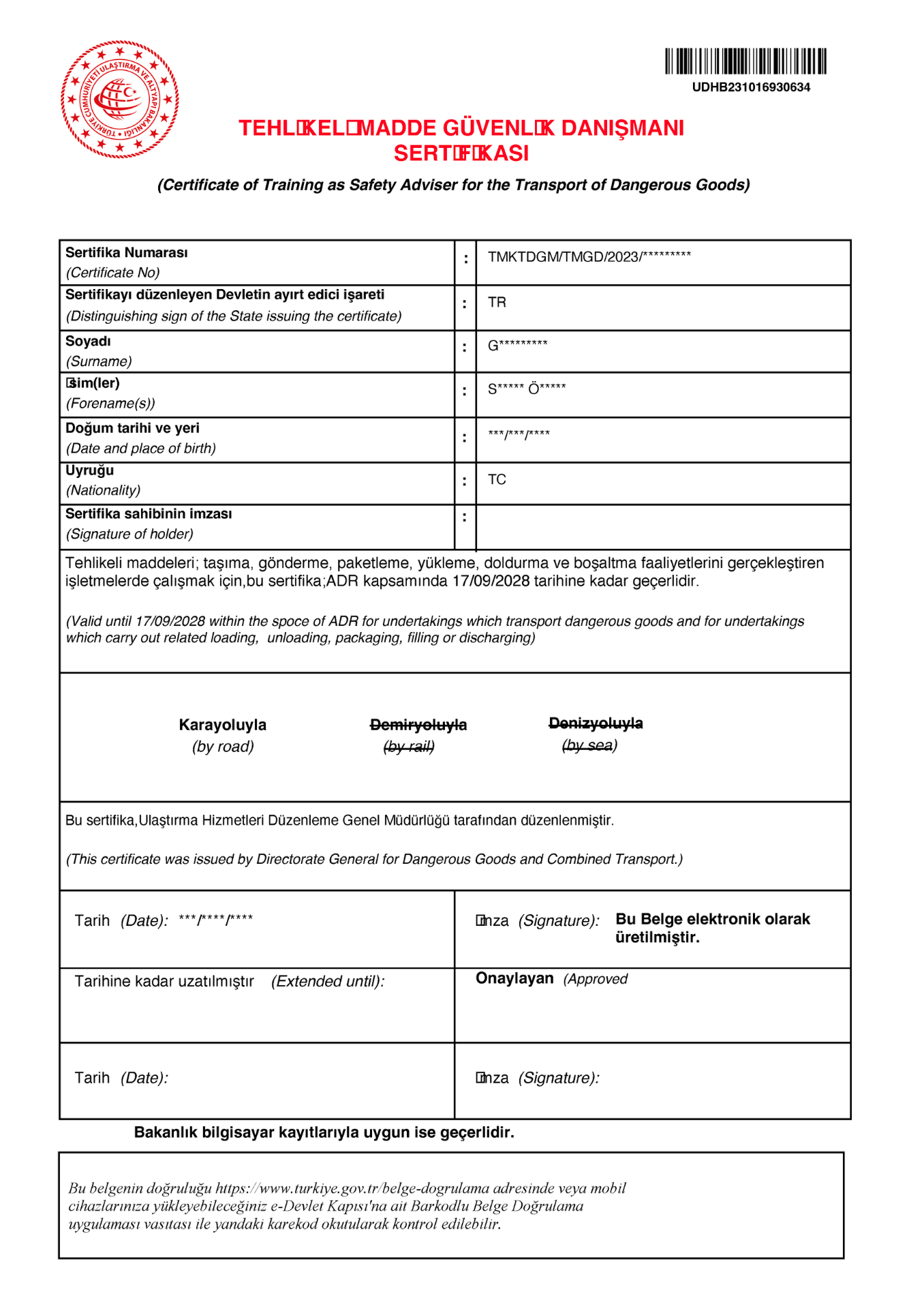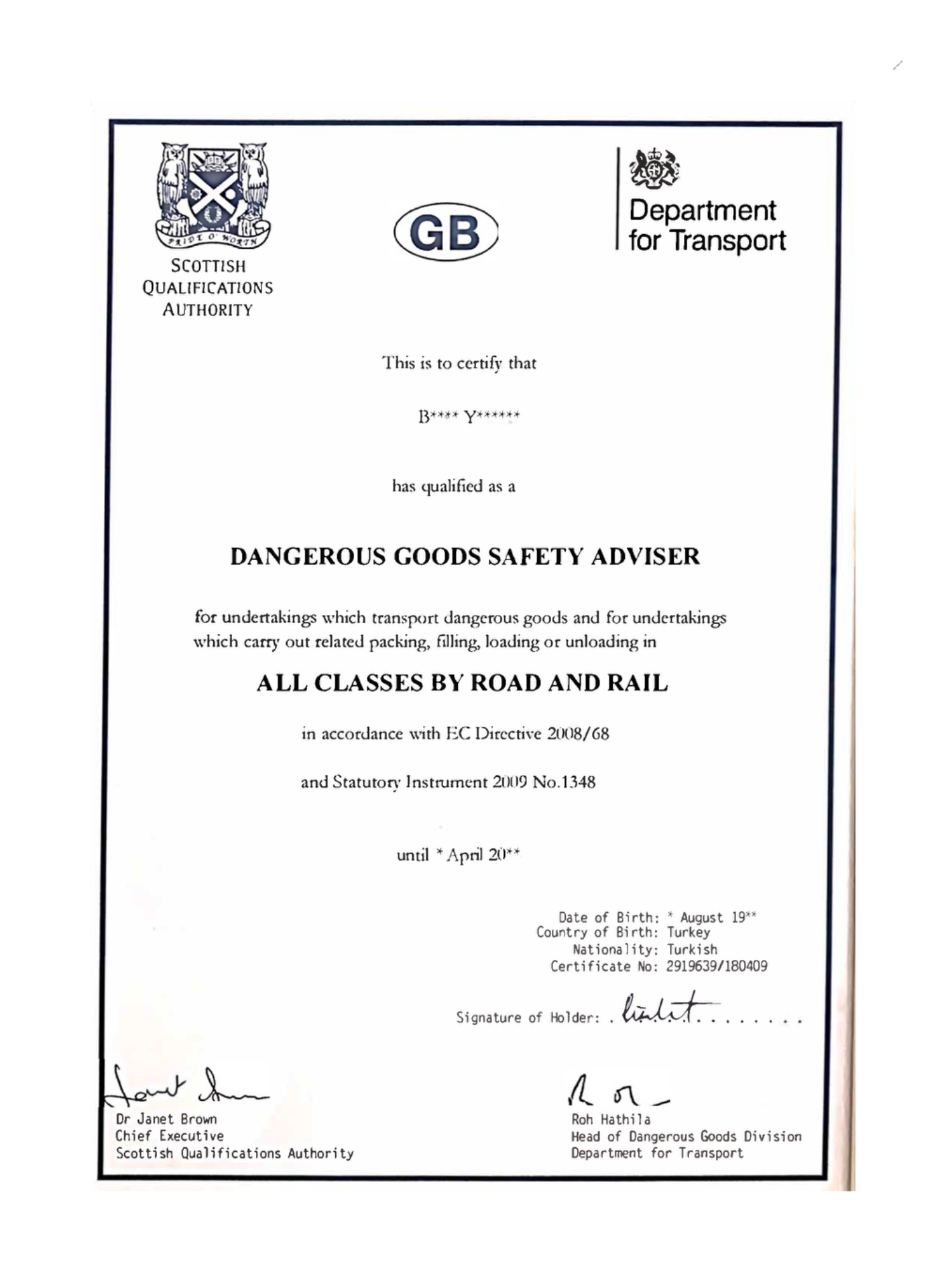 Ekibimizin deneyimli üyeleri, Birleşik Krallık kaynaklı DGSA (Dangerous Goods Safety Adviser) sertifikasına sahiptir.